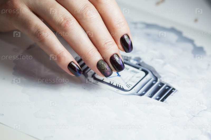 Шикарный маникюр, темный цвет лака с разноцветными разводами, фото крупным планом. Женские руки на простом фоне
