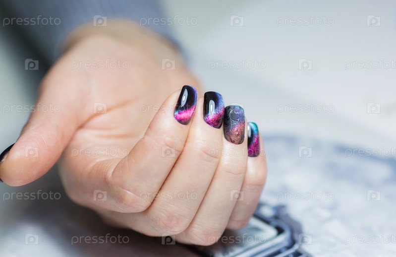 Шикарный маникюр, темный цвет лака с разноцветными разводами, фото крупным планом. Женские руки на простом фоне
