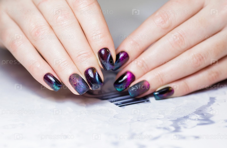 Шикарный маникюр, темный цвет лака с разноцветными разводами, фото крупным планом. Женские руки на простом фоне