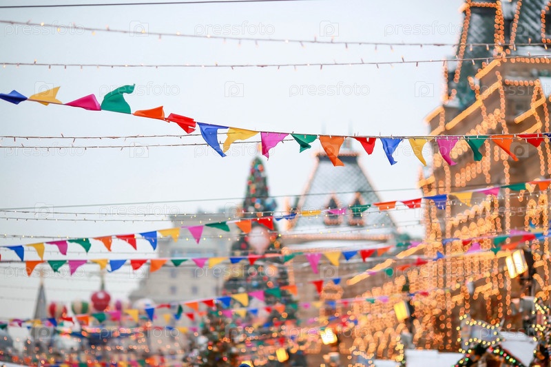 Новогоднее украшение Красной площади. Ярмарка жевательной резинки. Гирлянды, рождественские огни. Красивые праздничные пейзажи в городе Москве. Россия