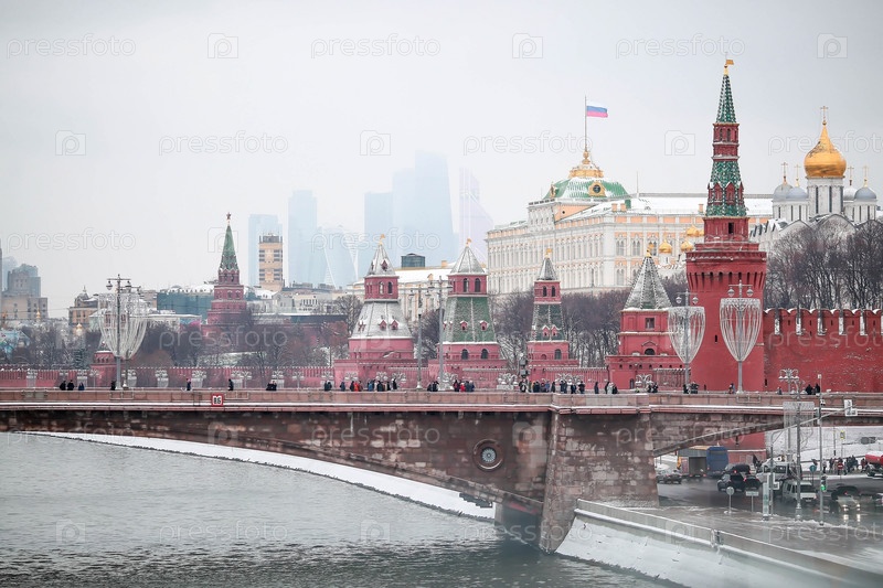 Вид Москвы в зимний день. столица России. Большой Кремлевский Дворец. Кремлевская церковь. Кремлевская набережная. Москва-река. Популярная туристическая достопримечательность. Визитная карточка Москвы