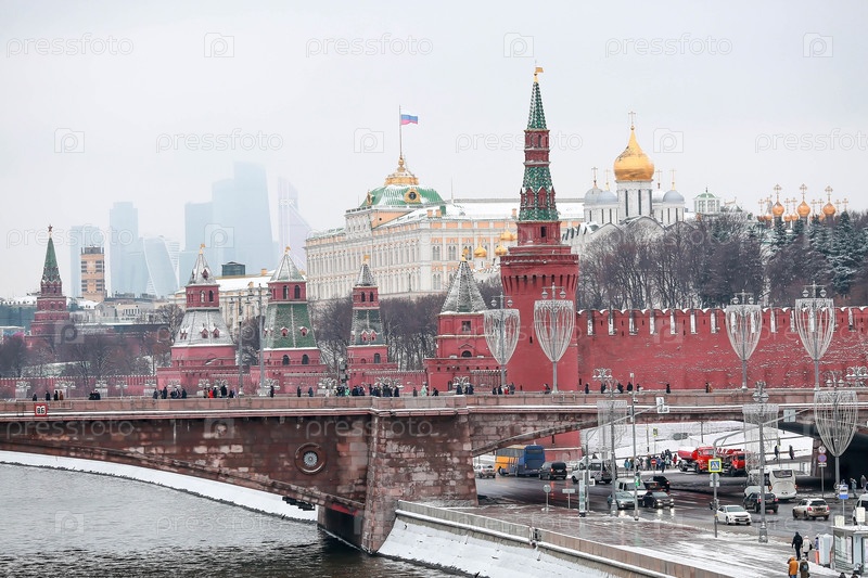 Вид Москвы в зимний день. столица России. Большой Кремлевский Дворец. Кремлевская церковь. Кремлевская набережная. Москва-река. Популярная туристическая достопримечательность. Визитная карточка Москвы