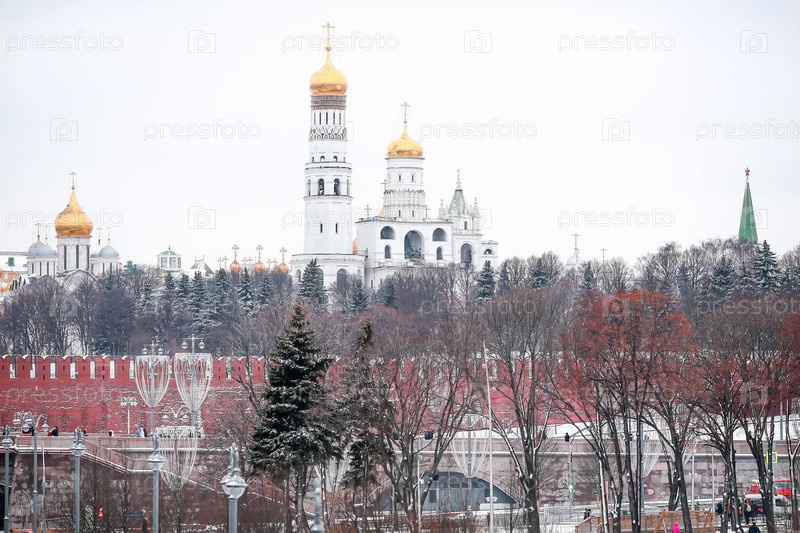 Вид Москвы в зимний день. столица России. Большой Кремлевский Дворец. Кремлевская церковь. Кремлевская набережная. Москва-река. Популярная туристическая достопримечательность. Визитная карточка Москвы