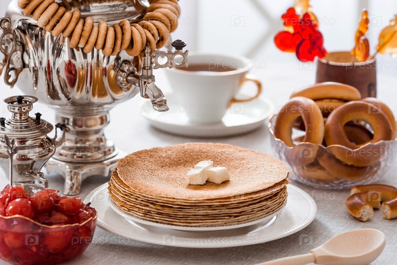 Русские традиции. Русский праздник Масленица. Натюрморт с чашкой чая, стопкой блинов, сметаной, медом, кубиками масла, рогаликами, сухофруктами, карамельным петушком и самоварами