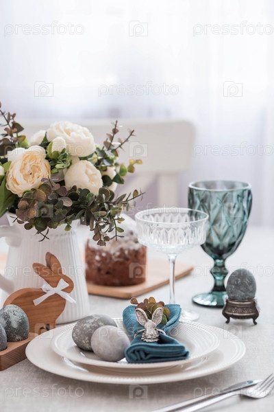 Весенняя сервировка стола. Тарелка с хлопковой салфеткой с зайчиком, тортом и пасхальными яйцами. Столовое серебро, пасхальные кролики и ваза с цветами на льняной скатерти. Концепция светлого праздника Пасхи