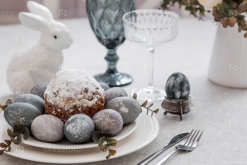 Весенняя сервировка стола. Тарелка с хлопковой салфеткой с зайчиком, тортом и пасхальными яйцами. Столовое серебро, пасхальные кролики и ваза с цветами на льняной скатерти. Концепция светлого праздника Пасхи