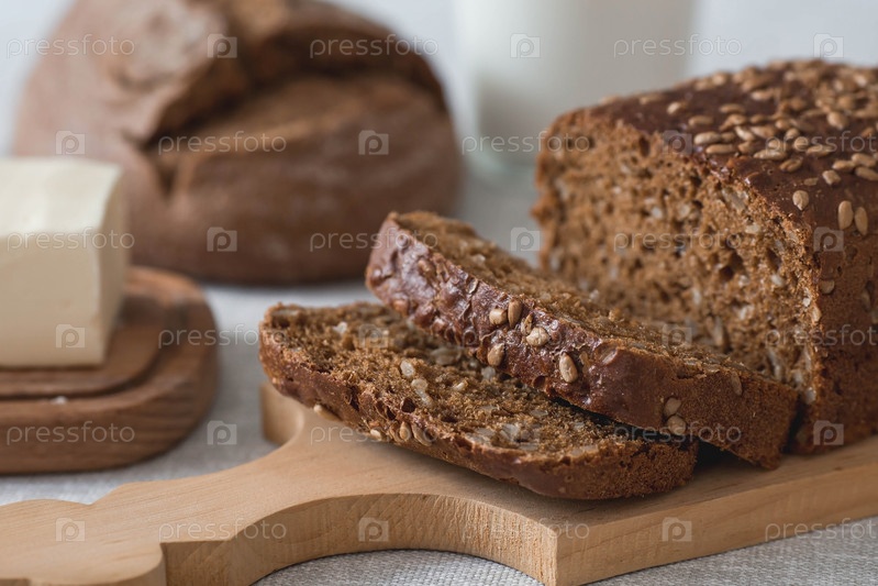 Свежий вкусный цельнозерновой ржаной хлеб с семенами крупным планом. Свежеиспеченный хлеб на деревянной доске. Контекст пекарни с вкусным хлебом. Кондитерские изделия