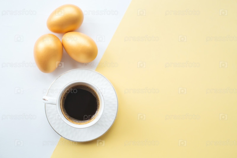 Золотые пасхальные яйца и кружка кофе на желтом и белом фоне. Вид сверху. Минимальная концепция