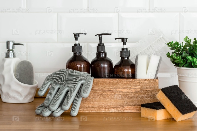 Деревянная коробка с чистящими средствами, перчатками, губками на современном деревянном столе