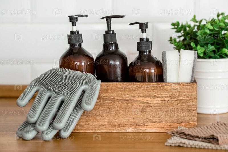 Деревянная коробка с чистящими средствами, перчатками, губками на современном деревянном столе