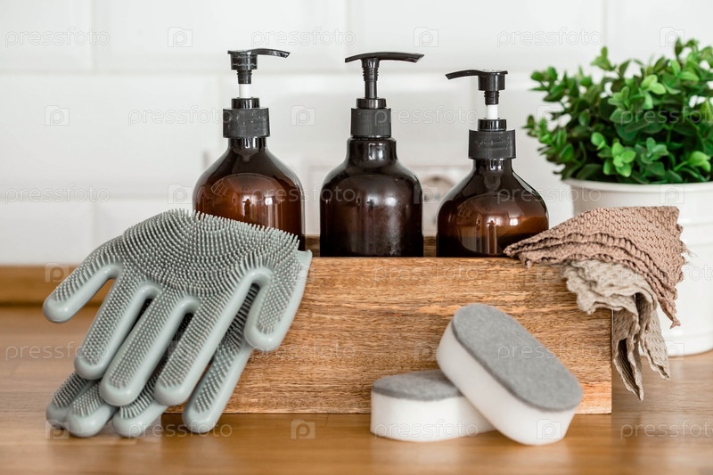 Деревянная коробка с чистящими средствами, перчатками, губками на современном деревянном столе