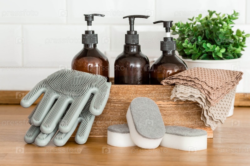 Деревянная коробка с чистящими средствами, перчатками, губками на современном деревянном столе