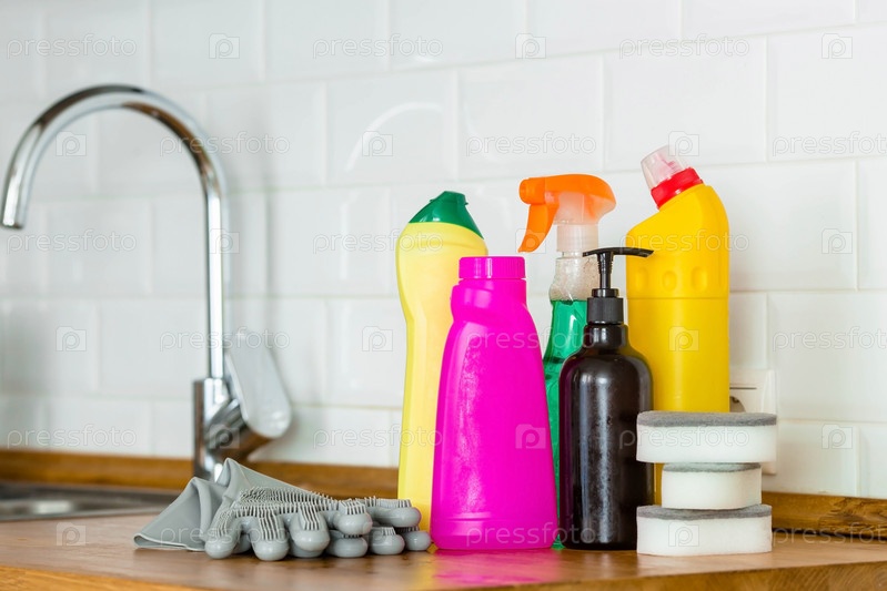 Чистящие средства на деревянном столе с размытым фоном современной кухни. Красочный набор для стирки с копировальным местом для текста