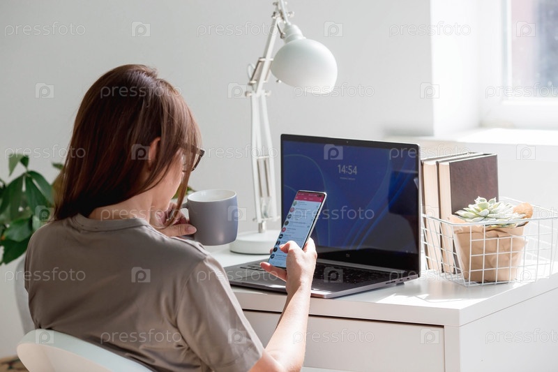 Молодая, счастливая, красивая деловая женщина-фрилансер сидит в домашнем офисе с ноутбуком и смартфоном в руках. Женщина работает дома или делает покупки в интернет-магазине