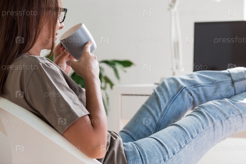 Молодая счастливая красивая деловая женщина-фрилансер сидит в домашнем офисе с ноутбуком, смартфоном и пьет кофе. Женщина работает дома. Кот на заднем плане