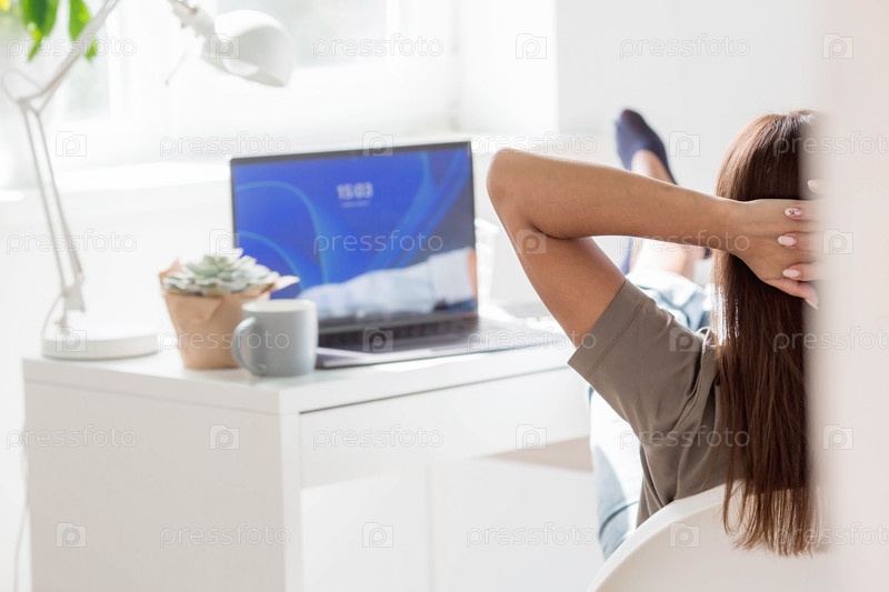 Молодая, счастливая, красивая деловая женщина-фрилансер сидит в домашнем офисе с ноутбуком и смартфоном в расслабленной позе. Женщина работает дома