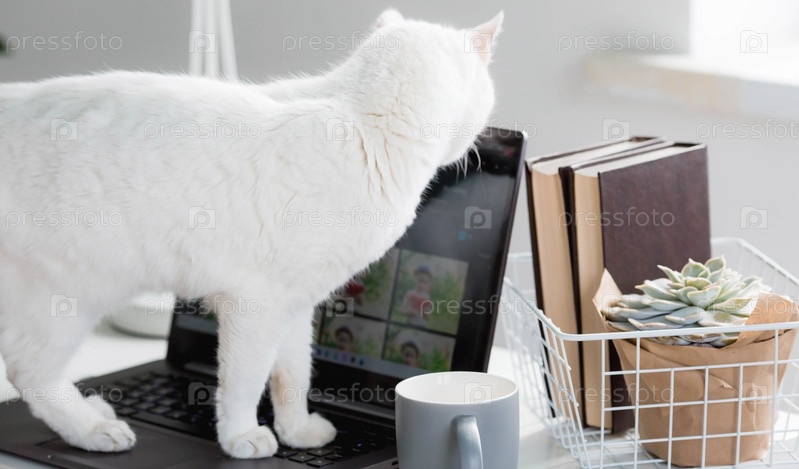Фриланс. Офис выполнен в светлых тонах. Белый стол с ноутбуком, книгами, кружкой, цветком и телефоном. Работа на дому. Начало рабочего дня. Концепция интерьера офиса
