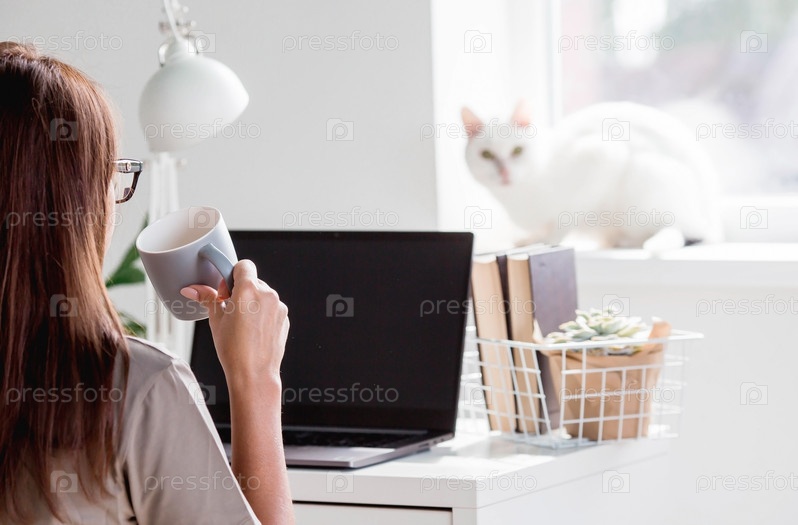 Молодая счастливая красивая деловая женщина-фрилансер сидит в домашнем офисе с ноутбуком, смартфоном и пьет кофе. Женщина работает дома. Кот на заднем плане