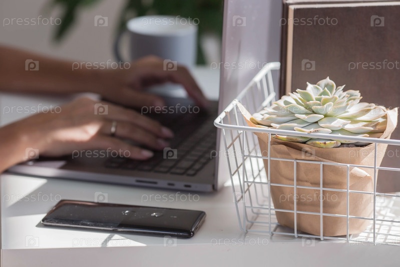 Руки внештатной женщины, сидящей в домашнем офисе с ноутбуком и смартфоном. Женщина работает дома. Начало рабочего дня. Концепция управления человеческими ресурсами и найма
