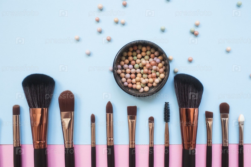Набор кистей для макияжа на фоне розового и аква цвета. Точка обзора сверху, плоская планировка