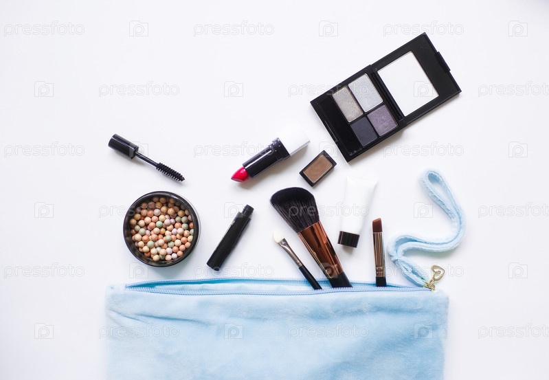 Косметические продукты, вытекающие из косметички на белом фоне. Плоская планировка, вид сверху. Концепция моды
