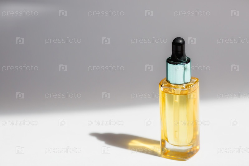 Макет стеклянной бутылки-капельницы. Косметическая пипетка на белом фоне