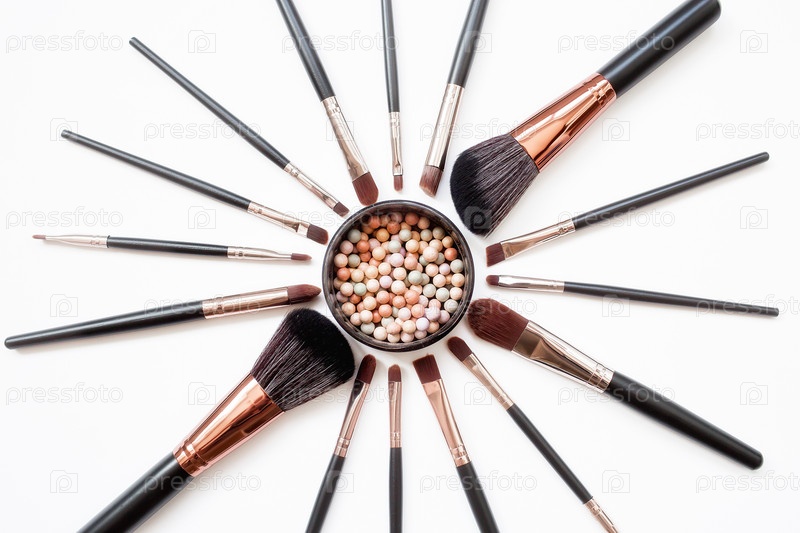 Кисти для макияжа и пудра, образующие круг на светлом фоне. Горизонтальный шаблон визитной карточки визажиста или дизайна флаера