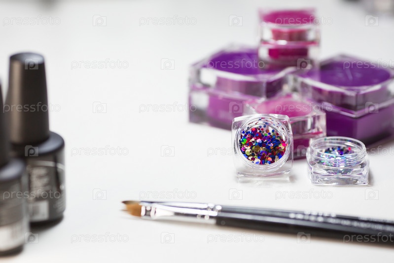 Студия красоты. Материалы для маникюра на белом фоне. Кисти, пайетки, гель-лак розовый