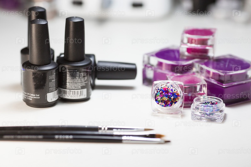 Студия красоты. Материалы для маникюра на белом фоне. Кисти, пайетки, гель-лак розовый