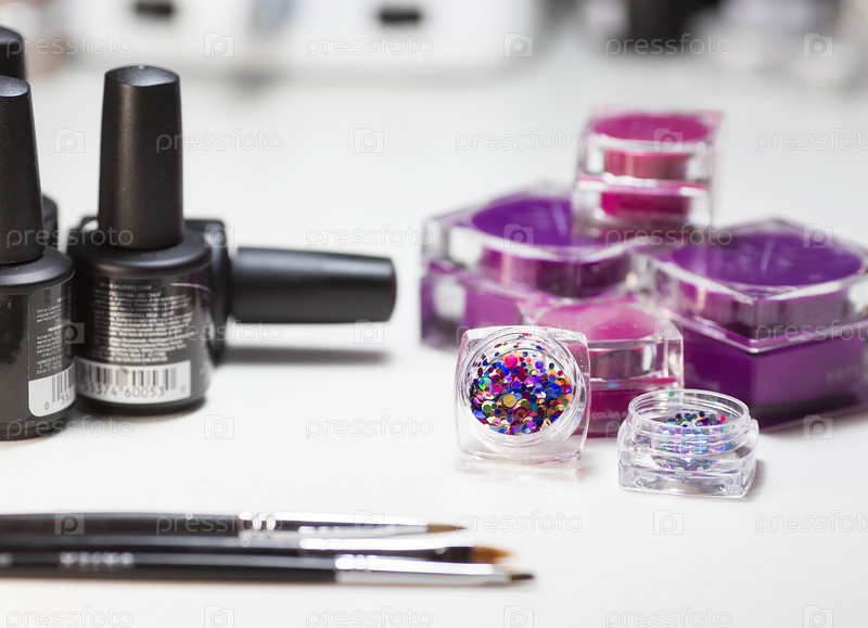 Студия красоты. Материалы для маникюра на белом фоне. Кисти, пайетки, гель-лак розовый