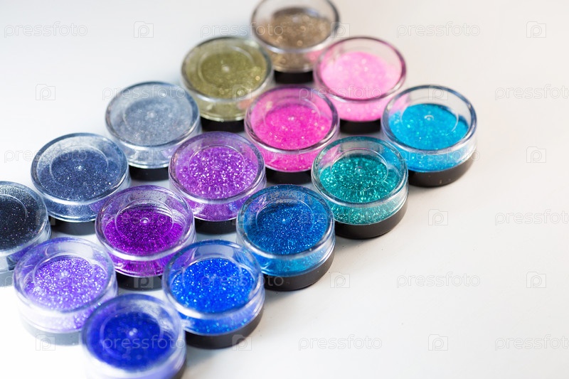 Студия красоты. Материалы для дизайна ногтей на светлом фоне. Красочные баночки с блестками и кистями