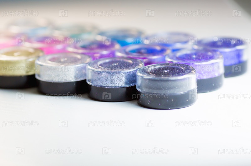 Студия красоты. Материалы для дизайна ногтей на светлом фоне. Красочные баночки с блестками и кистями