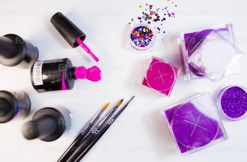 Студия красоты. Материалы для маникюра на белом фоне. Кисти, пайетки, гель-лак розовый