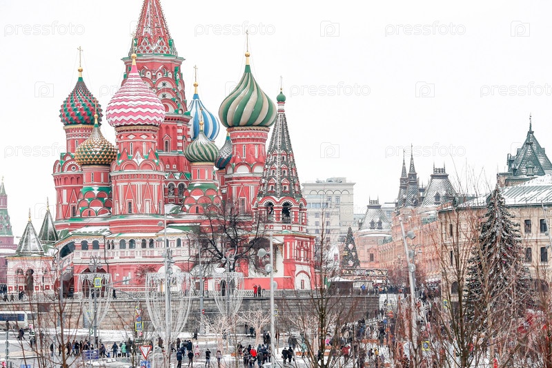 Новогоднее украшение Москвы. Красивые праздничные пейзажи в городе. Собор Василия Блаженного на Васильевском спуске на Красной площади в туманный зимний день на фоне серого неба