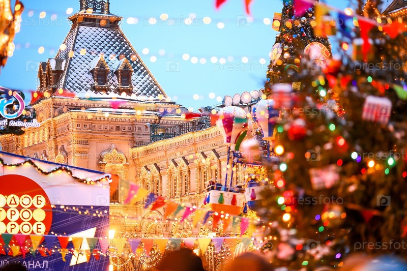 Новогоднее украшение Красной площади. Ярмарка жевательной резинки. Гирлянды, рождественские огни. Красивые праздничные пейзажи в городе Москве. Россия