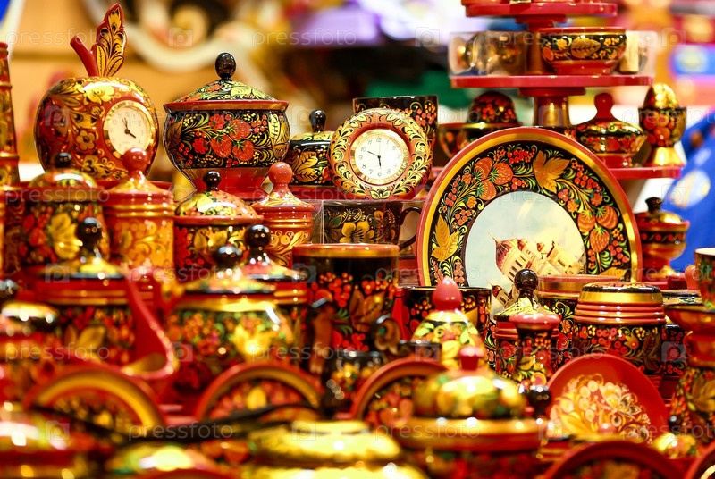 Путешествие по России. Русская ярмарка в зимний день. Подарки и сувениры из России. Хохлома – старинный русский народный промысел. Россия, Москва