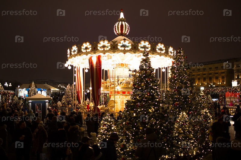 Новогодние праздники в Москве. Наряженные елки, карусель и толпа людей в центре города на Манежной площади. Россия