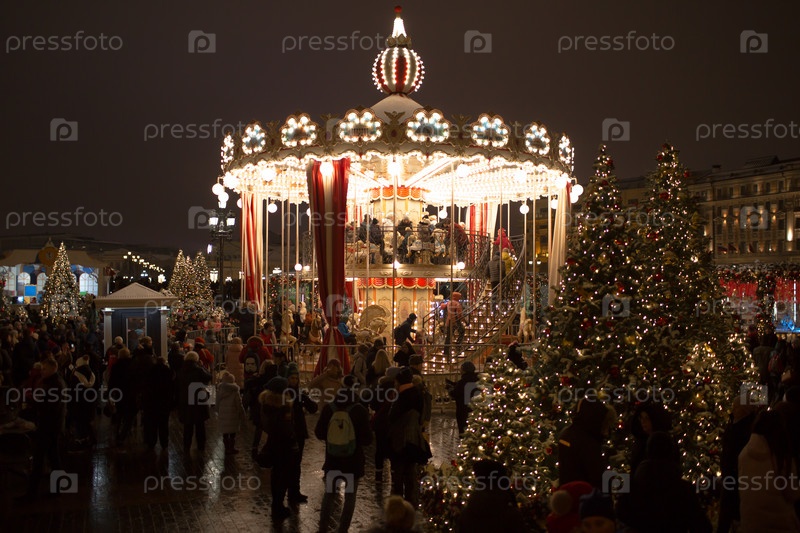 Новогодние праздники в Москве. Наряженные елки, карусель и толпа людей в центре города на Манежной площади. Россия