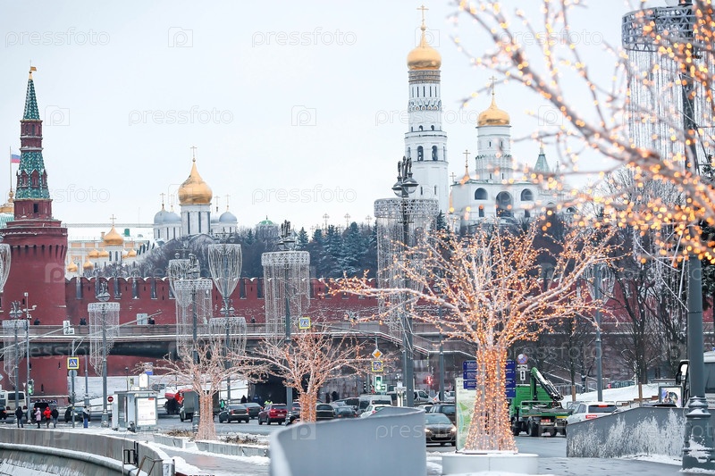 Вид Москвы в зимний день. столица России. Большой Кремлевский Дворец. Кремлевская церковь. Кремлевская набережная. Москва-река. Популярная туристическая достопримечательность. Визитная карточка Москвы