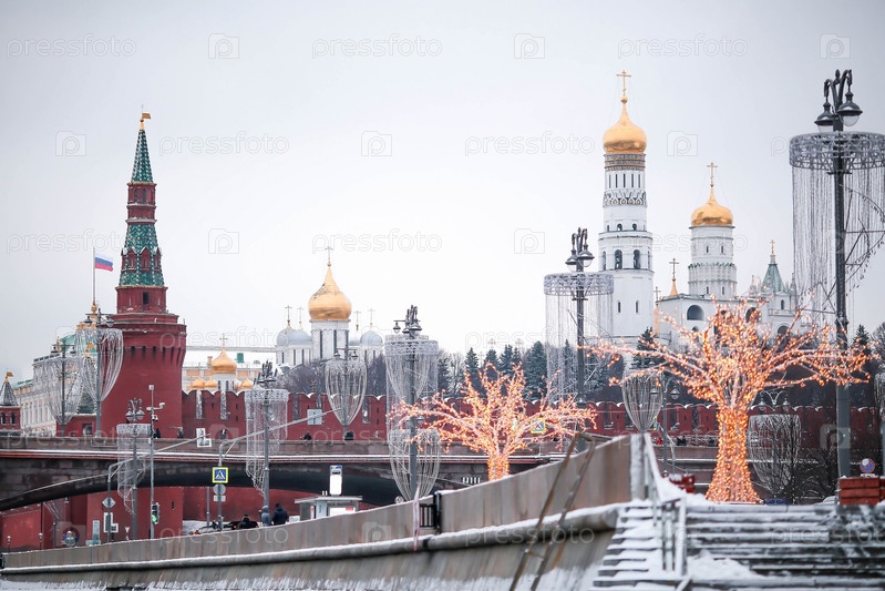 Вид Москвы в зимний день. столица России. Большой Кремлевский Дворец. Кремлевская церковь. Кремлевская набережная. Москва-река. Популярная туристическая достопримечательность. Визитная карточка Москвы