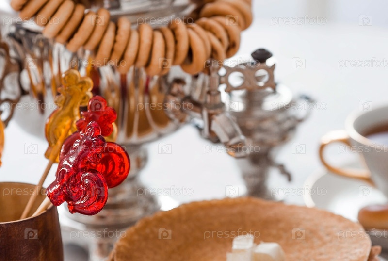 Русские традиции. Русский праздник Масленица. Натюрморт с чашкой чая, стопкой блинов, сметаной, медом, кубиками масла, рогаликами, сухофруктами, карамельным петушком и самоварами