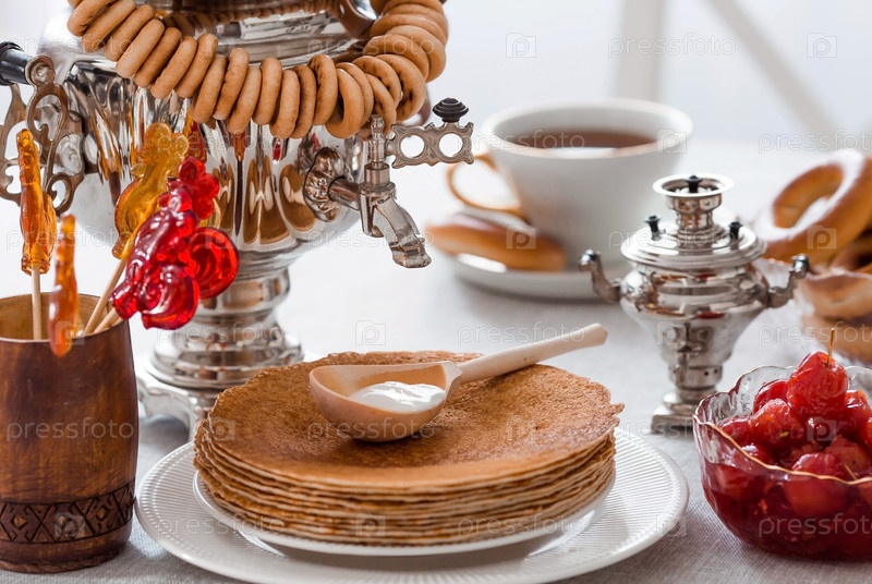 Русские традиции. Русский праздник Масленица. Натюрморт с чашкой чая, стопкой блинов, сметаной, медом, кубиками масла, рогаликами, сухофруктами, карамельным петушком и самоварами