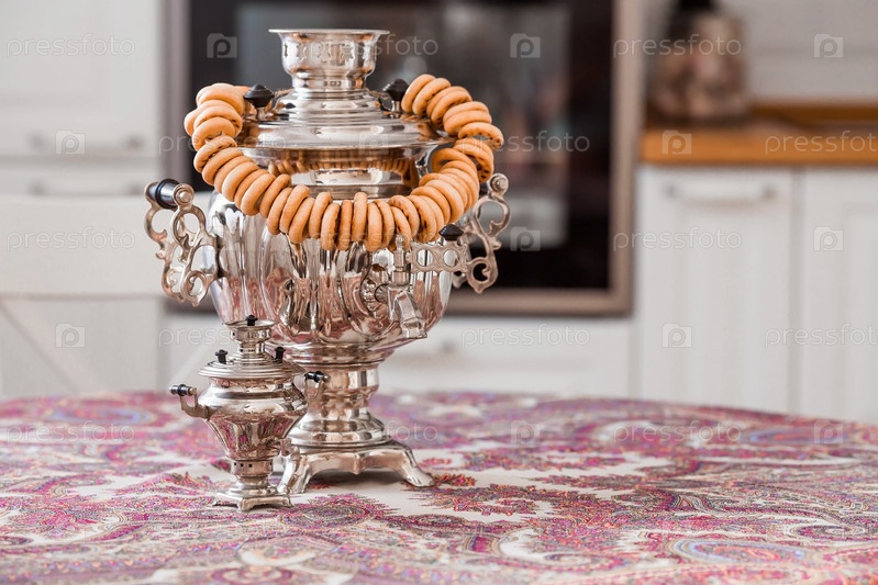 Русские традиции. Чаепитие с самоваром. Натюрморт с бубликами, сухофруктами и русскими самоварами в интерьере современной белой кухни