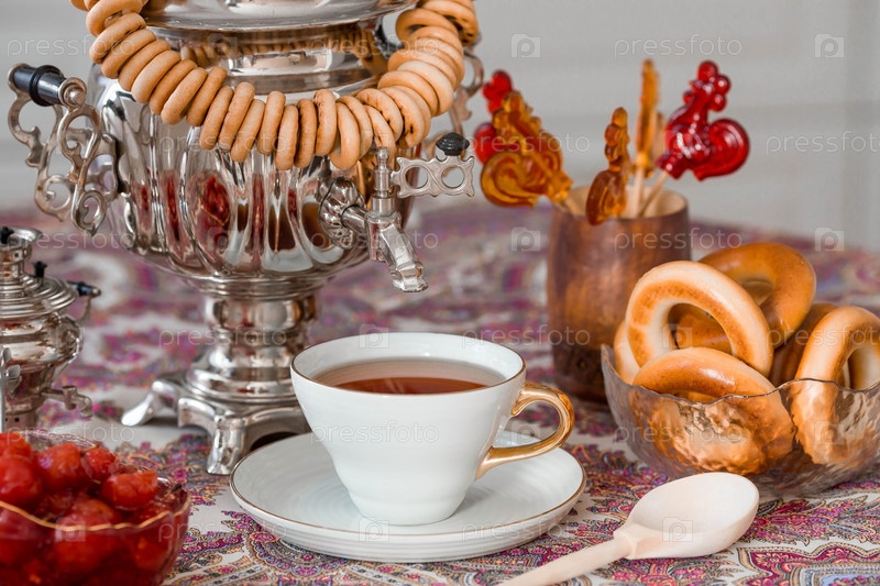 Русские традиции. Чаепитие с самоваром. Натюрморт с чашкой чая, рогаликами, сухофруктами, яблочным джемом, карамельным петушком и русскими самоварами