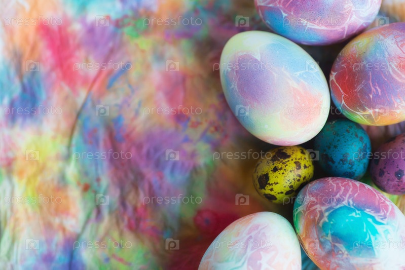 Яркие, разноцветные пасхальные яйца на красочном фоне. Минимальная концепция. Карточка с местом для копирования текста