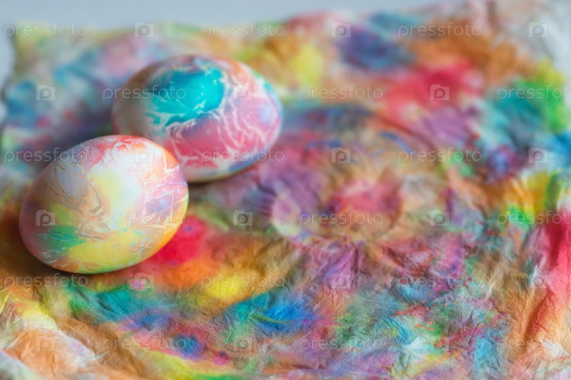 Яркие, разноцветные пасхальные яйца на красочном фоне. Минимальная концепция. Карточка с местом для копирования текста