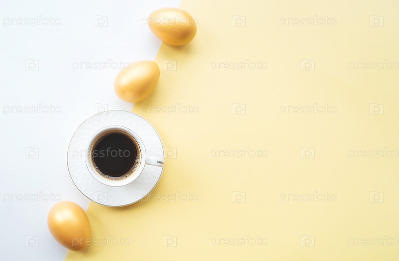 Золотые пасхальные яйца и кружка кофе на желтом и белом фоне. Вид сверху. Минимальная концепция