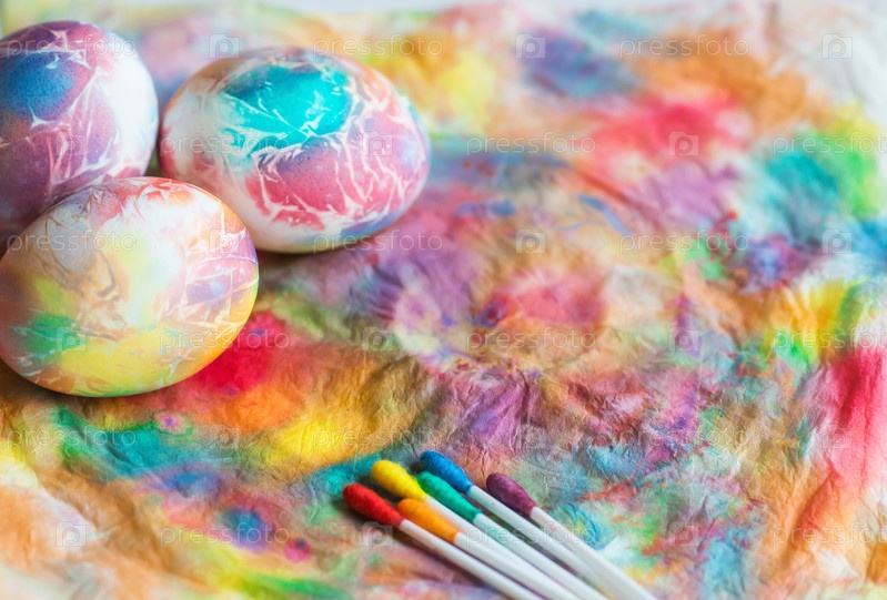 Яркие, разноцветные пасхальные яйца на красочном фоне. Минимальная концепция. Карточка с местом для копирования текста