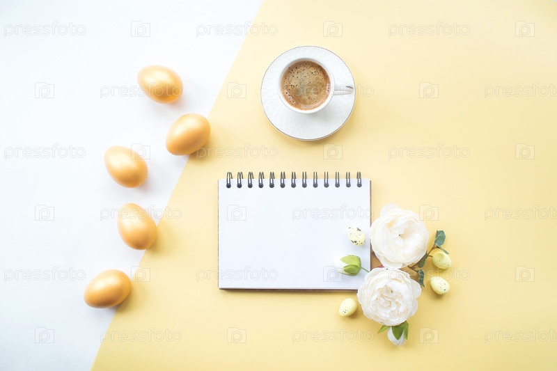 Золотые пасхальные яйца, кофейная кружка, нежные цветы и блокнот