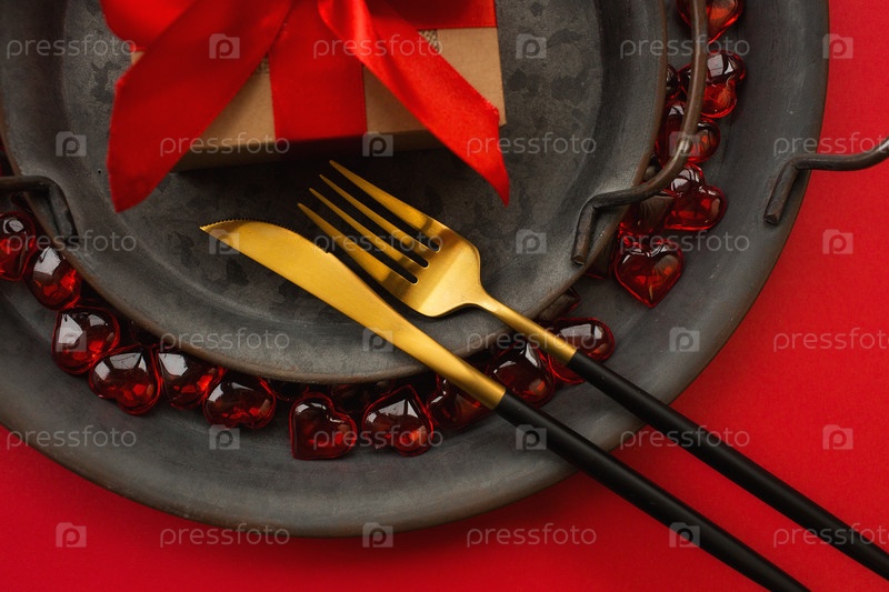 Старинные тарелки, праздничная сервировка стола с подарочной коробкой на красном фоне. Концепция любви. День Святого Валентина